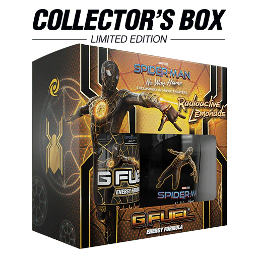 • Limited-edition G FUEL Radioactive Lemonade Hybrid Suit Collectors Box to match one of Peter Parker’s newest Spiderman suits from the movie No Way Home. The bubblegum lemonade flavor will shock your memory of the sweet and tangy ice pop mixed with lemonade. It’s a combo that’ll give you the radioactive energy to swing through the city or play games all day!